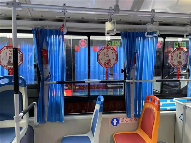車廂內(nèi),一面面鮮紅的黨旗、國旗成為了最靚的風景和最暖的愛國情懷,不僅使國慶節(jié)的氣氛變濃了,也使得每一位乘客的愛國情感變得更加濃郁,充分表達了我們公交人對祖國的敬重和強烈的愛國情懷;“我愛祖國”“歡度國慶”等貼紙、拉花,更是渲染了濃濃的國慶喜慶氛圍;“核心價值觀”“彩色中國結”“孝老敬親”等中國傳統(tǒng)文化精髓,以宣傳畫的形式展示在車廂內(nèi),通過公交這個文明窗口,使廣大乘客在乘車時就能被中國優(yōu)秀傳統(tǒng)文化所熏陶,進一步提高國慶節(jié)期間運營服務質量的同時,一股股濃濃的愛國情懷也不由在每個人的心中涌動。