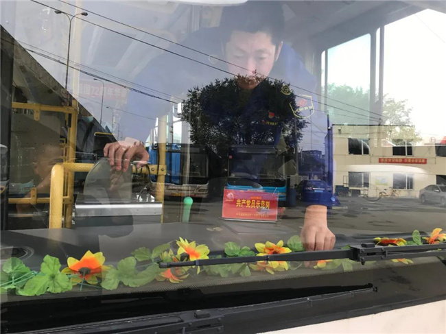249車隊迎國慶,圖為新黨員駕駛員王眾裝飾“黨員服務質量大提升示范崗”車廂。