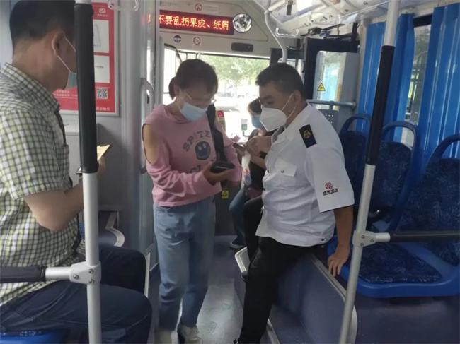在長客西站264路、103路始發(fā)站,副隊(duì)長程玉磊配合公交駕駛員對乘客的健康碼、72小時(shí)核酸陰性證明、規(guī)范佩戴口罩、測量體溫等工作進(jìn)行檢查,廣大乘客主動配合。