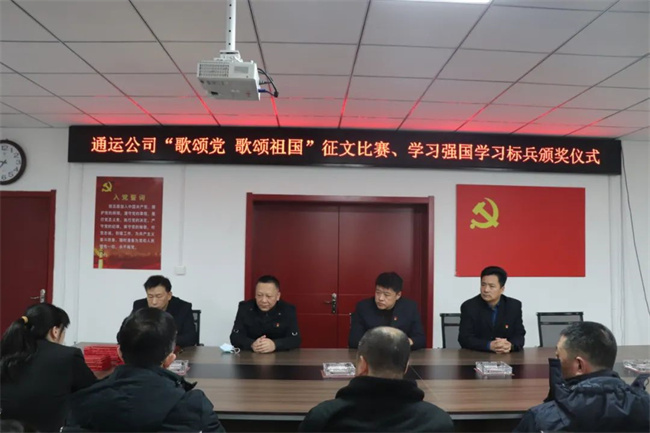1月12日上午,通運公司在一樓會議室召開“歌頌黨 歌頌祖國”征文比賽、學習強國學習標兵頒獎儀式,公司領導班子及各支部書記、獲獎職工代表參加,共30余人。