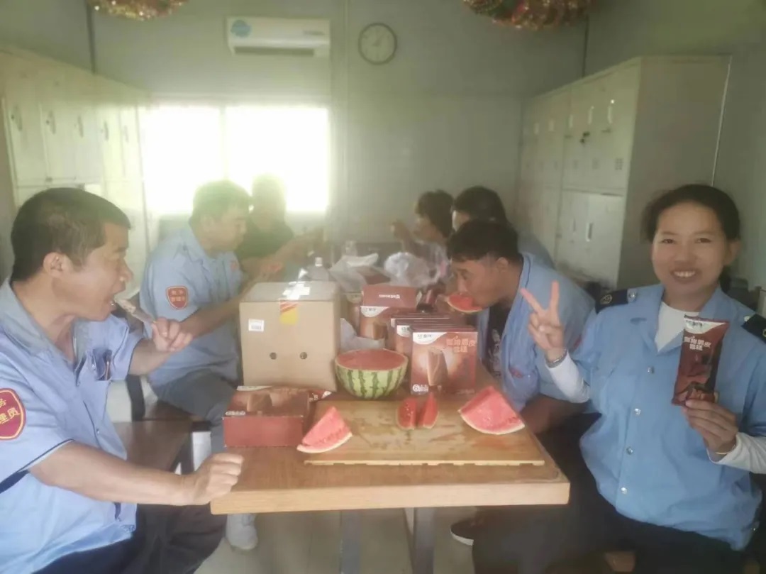 在210.227.280路車(chē)隊(duì)站務(wù)室,處于運(yùn)營(yíng)間歇的駕駛員們正圍坐在一起,有的在大口吃著西瓜,有的在細(xì)品雪糕的香甜和涼爽,大家有說(shuō)有笑,一解暑氣。一旁的駕駛員楊麗麗為大家服務(wù)著,切西瓜、遞雪糕,其樂(lè)融融。