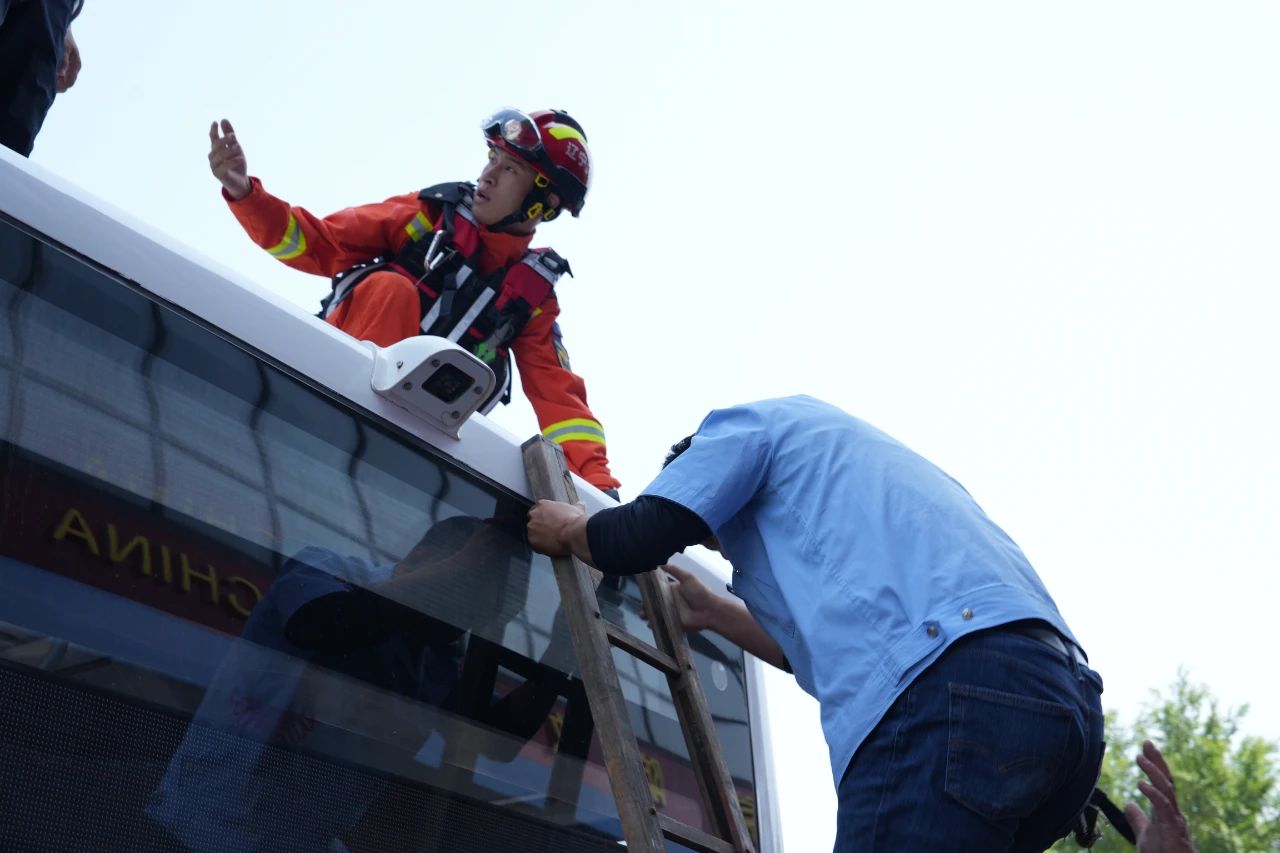演練模擬了公交運營中多種突發(fā)場景,包括車輛火災撲救、乘客攜帶危險品處置、積水路段熄火應對以及車輛遇險(進水、被困)時緊急停車、使用滅火器/安全錘破窗、疏散逃生等。