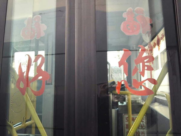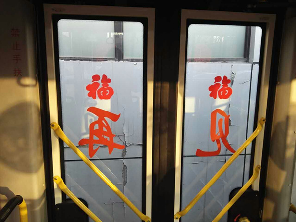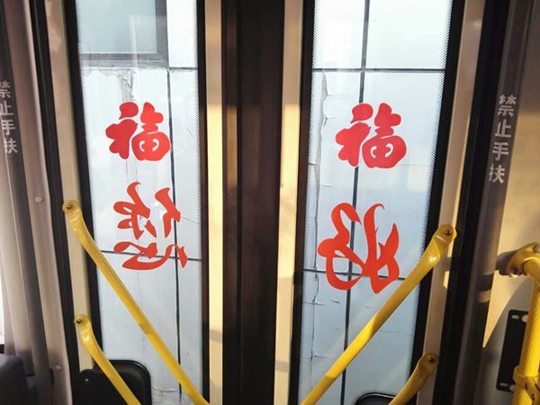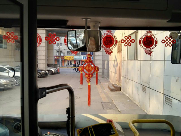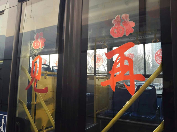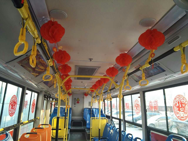沈陽客運集團公司精心布置了車輛,粘貼了新年祝福標語、福字、窗花,懸掛中國結(jié)和小燈籠,在車廂內(nèi)進行裝飾,營造出移動的溫馨家庭感覺。