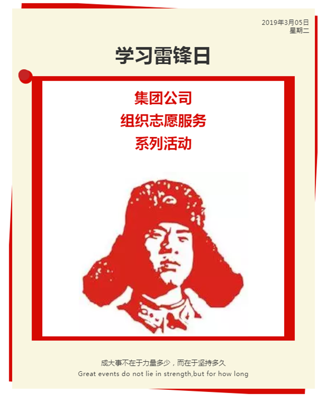 2019年3月5日是第56個(gè)學(xué)雷鋒紀(jì)念日,為進(jìn)一步弘揚(yáng)“雷鋒精神”,踐行社會(huì)主義核心價(jià)值觀,不斷激勵(lì)和引導(dǎo)集團(tuán)廣大職工積極向上、樂于助人的服務(wù)理念和奉獻(xiàn)精神,2019年3月5日,集團(tuán)公司團(tuán)委組織廣大團(tuán)員青年開展了學(xué)習(xí)雷鋒精神志愿服務(wù)主題活動(dòng)。
