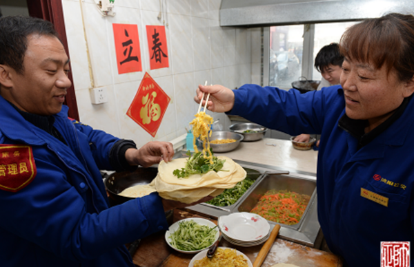 “哎呦,今天烙春餅啦!難怪老遠(yuǎn)兒就聞見了香味兒??欤o我先來兩張!”2月3日大年初七,是節(jié)后的第一個工作日,恰逢立春。11時左右,211路駕駛員張智剛跑完一圈兒回到大北門終點(diǎn)站,就被食堂的飯香吸引過去。